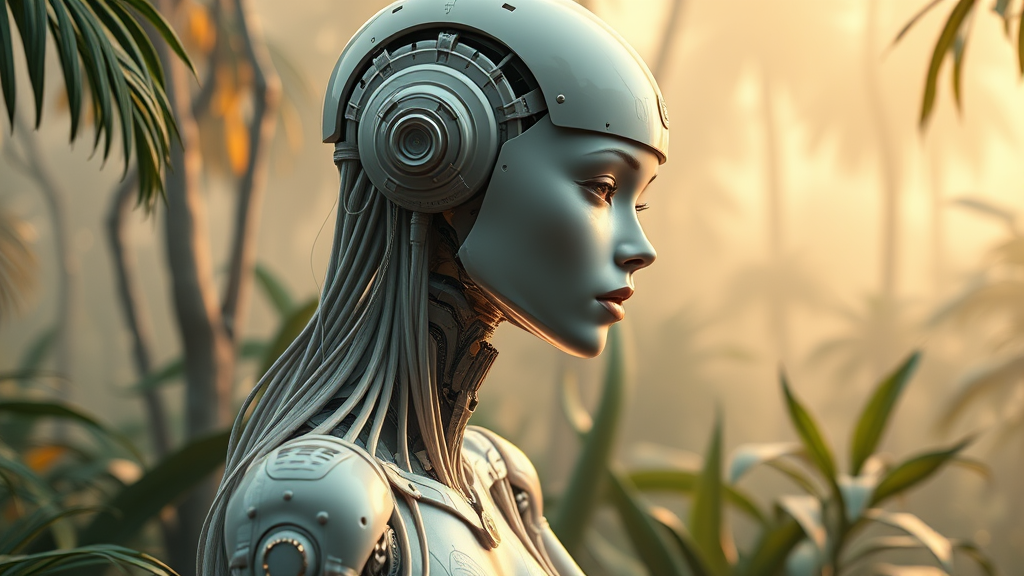 The portrait depicts an exquisitely detailed, full-length, hyperrealistic 3D render of a porcelain-complexioned android with a strikingly beautiful profile. This intricate cyborg, adorned with visible robotic components, is illuminated by soft studio lighting that accentuates vibrant, luxurious cyberpunk details against an elegant backdrop reminiscent of H.R. Giger’s style. The composition is rendered in octane for breathtaking clarity, capturing the delicate interplay of lace, latex, and rubber materials seamlessly integrated with advanced technology. Fine facial details reveal anatomical precision, with exposed cable electric wires and microchips, creating a masterpiece suitable for an 8k CG unity wallpaper. The android, kneeling gracefully in a jungle rainforest setting on an unknown planet, suggests the discovery of advanced technology. Its design, influenced by Sathish Kumar, includes a sleek silver helmet, emphasizing the android's futuristic elegance. The ambiance is enriched by the jungle's vibrant colors and textures, rendered with remarkable quality, showcasing a harmonious blend of natural and technological elements. The cohesive unity of form and function is exhibited in this hyper-detailed illustration, a testament to the interplay between organic and artificial worlds.