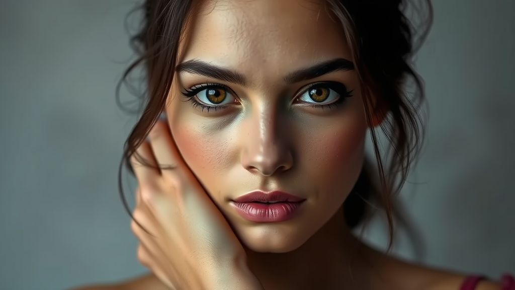 The portrait of a woman with expressive brown eyes, her face capturing a serene expression, rendered in the style of Yigal Ozeri. Set against a backdrop of gentle light navy and subtle light gray tones, reflecting the elegance of Patrick Demarchelier's photography. The composition draws inspiration from Alayna Lemmer's focus on the delicate interplay of joints and connections. Infused with the dramatic chiaroscuro reminiscent of Caravaggism, the image is bathed in soft, controlled studio lighting, emphasizing both the grace and strength of the subject.