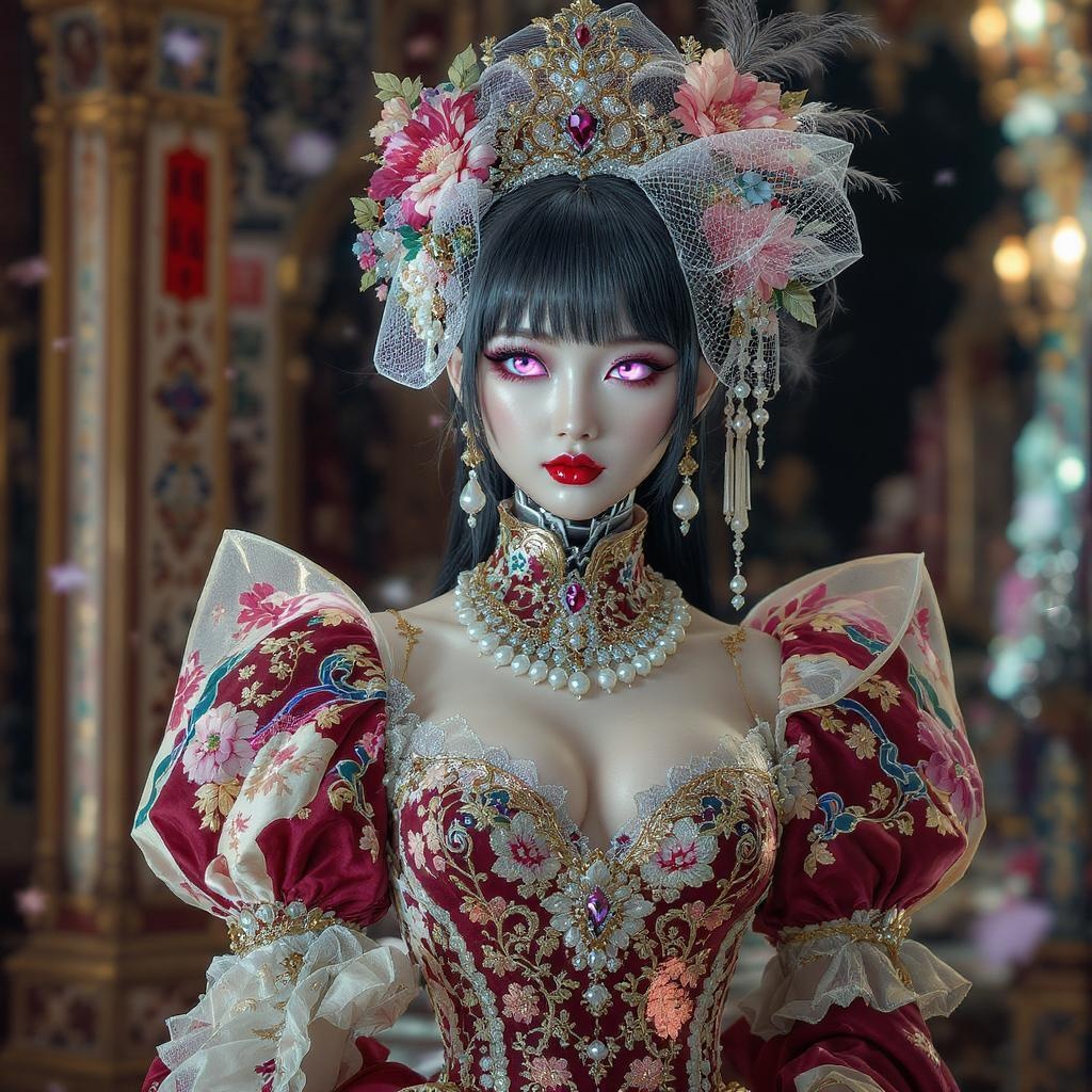 The portrait of an exquisitely beautiful cyborg girl adorned in a fantastical high fashion ensemble, blending Victorian and Chinese influences with an elaborate and ornate design. Her attire features intricate veils and a Victorian dress with Chinese patterns, reminiscent of the siren form from Jibaro. The outfit is detailed with couture ornamentation of gold filigree, creating a dynamic and particulate appearance rich with vibrant colors. Inspired by the elegance seen in Harper's Bazaar, the composition is centered and captures the artstation aesthetic with smooth, sharp focus rendered in octane, reflecting radiant neon white glow with reflect and caustics effects. The portrait showcases Autochrome Pearl Portrait elements alongside Pearl Silverplate with accents of Golden Jewelry and Silverplate. The character's facial features are intricately detailed, rendered with an ultra-fine touch by masters like Kim Jung Gi, Soey Milk, WLOP, Artgerm, and Greg Rutkowski, drawing inspiration from the ethereal style of Alphonse Mucha. Using Unreal Engine 5's global illumination, the environment is portrayed with radiant light, reminiscent of a richly detailed Final Fantasy universe.