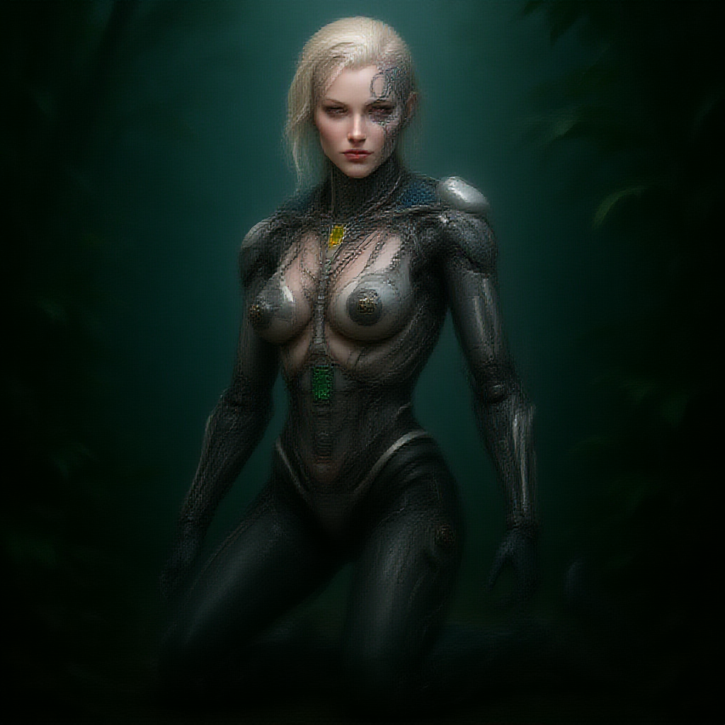 The prompt describes an intricately detailed whole-body portrait of a beautiful porcelain-profile android with cyborg features, designed with complex 3D rendering. The focus is on an ultra-realistic, hyper-detailed depiction set in a luxurious cyberpunk theme with anatomical and facial muscle details. The portrait showcases the android with robotic parts, electric wires, and microchips, illuminated by soft studio and rim lighting. The background is elegant and H. R. Giger inspired, with vibrant elements ensuring an 8K best-quality masterpiece suitable for use as an illustration or wallpaper. In this future setting, humans can transfer their consciousness into robots, depicted by the android on its knees amidst a jungle rain forest scene. Minor creative changes enhance the scene with vivid colors, emphasizing the metallic textures, and adding subtle elements that suggest a harmony between high-tech and nature. Avoiding clichés, multiple elements, errors, or distortions, this vision is futuristic and elegant—an ultimate synthesis of technology and art.