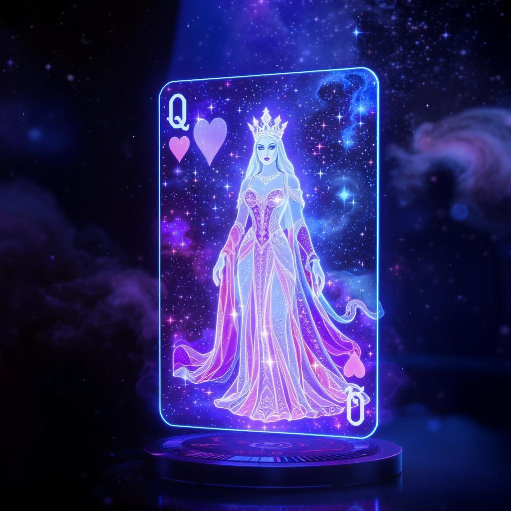 The Queen of Hearts card morphs into a 3D hologram, shimmering with cosmic energy. As the Queen materializes, stars and nebulae swirl around her, evoking the sensation of a cosmic journey. Her attire sparkles with celestial motifs, and her crown glows like a cluster of distant stars. The hologram hovers before you, its backdrop transforming through scenes of swirling galaxies and luminous quasars. An ideal spectacle for space-themed gatherings, science fiction events, or cutting-edge tech showcases.