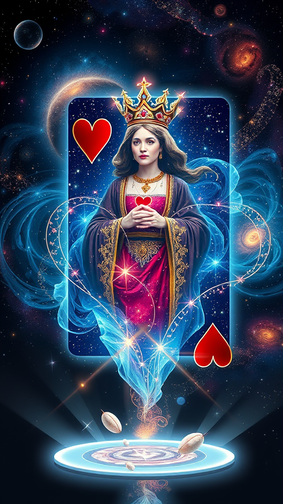 The Queen of Hearts card morphs into a captivating 3D hologram composed of cosmic energy. As the Queen materializes, swirling stars and galaxies surround her, evoking the sensation of an interstellar voyage. Her regal attire is embellished with intricate celestial motifs, while her crown radiates like a constellation of brilliant stars. The hologram hovers gracefully before you, the backdrop transitioning seamlessly through spectacular cosmic vistas, from vibrant nebulae to enigmatic black holes. This scene is an ideal centerpiece for space-themed events, sci-fi conventions, or advanced technology exhibits.