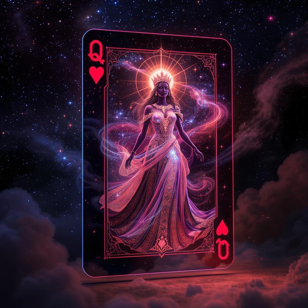 The Queen of Hearts card morphs into a dazzling 3D hologram radiating cosmic energy. As the Queen materializes, constellations and nebulas swirl around her, evoking the sensation of voyaging through the cosmos. Her gown is intricately woven with celestial motifs, and her crown is a luminous nebula. The hologram hovers before you as the backdrop shifts through a series of breathtaking cosmic vistas, from swirling galaxies to radiant supernovae. Perfect for space-themed gatherings, sci-fi conventions, or cutting-edge tech expos.
