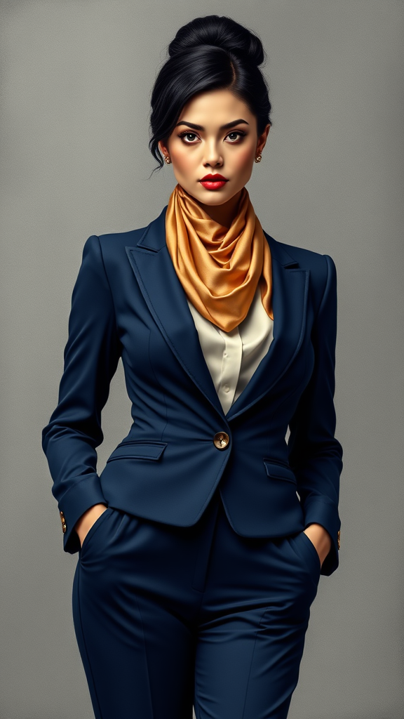 The quintessential female business icon embodies a blend of power and elegance. She stands confidently in a flawlessly tailored navy blue pantsuit, paired with a crisp white blouse and an elegant silk scarf gracefully encircling her neck. Her jet-black hair is styled into a sleek bun, emphasizing her striking features and piercing gaze. The artwork captures the intricate details of her facial expression, conveying a potent mix of determination and intelligence. In high-resolution, the piece reveals the fine stitching of her suit, the subtle texture of the silk scarf, and the soft gleam of her patent leather heels. The art style is hyper-maximalist, fusing elements of Art Deco and Art Nouveau with a modern twist. Gold leaf and metallic accents deepen the piece, showcasing the artist's exquisite attention to detail. This remarkable artwork inspires awe with its novel portrayal of a powerful female figure, standing as a breathtaking, epic masterpiece that encapsulates the essence of contemporary femininity and strength.