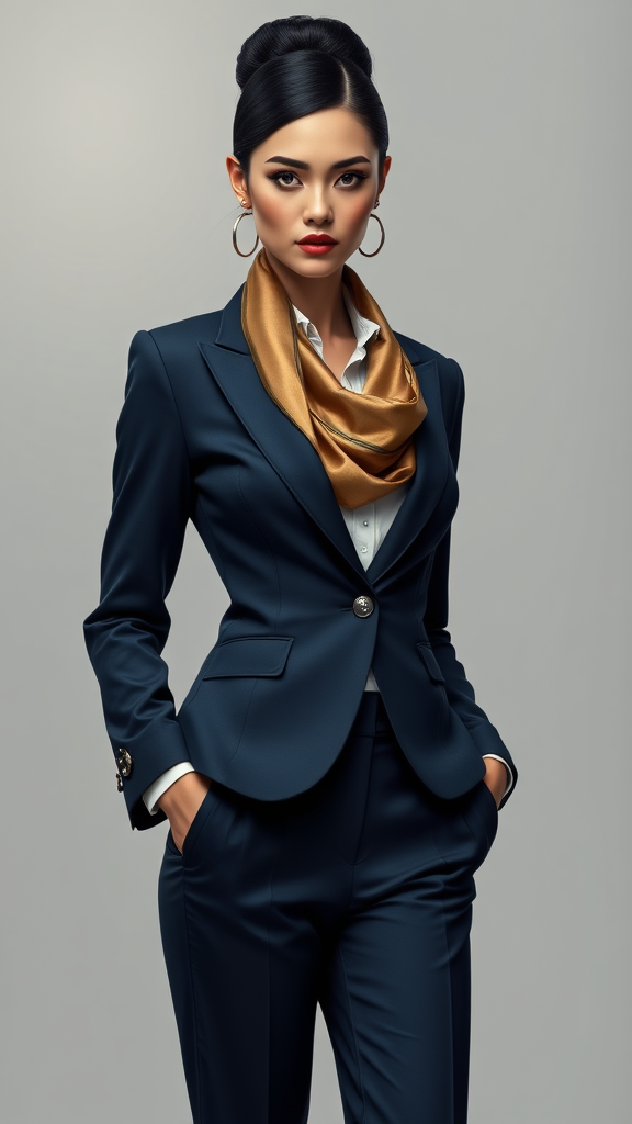 The quintessential female business leader epitomizes strength and elegance. She stands with poise, radiating confidence in a perfectly tailored navy pantsuit, complemented by a pristine white button-up shirt and a lavish silk scarf elegantly wrapped around her neck. Her sleek jet-black hair is meticulously styled into a bun, accentuating her striking features and piercing gaze. The artwork captures the intricate details of her expression, embodying a sense of determination and intellect. The high-resolution image reveals the fine stitching of her suit, the texture of the silk scarf, and the subtle shine of her patent leather heels. The hyper-maximalist art style fuses Art Deco and Art Nouveau elements with modern flair. Gold leaf and metallic accents enrich the piece with depth, showcasing the exquisite attention to detail. This remarkable artwork inspires awe with its original representation of a powerful female icon, encapsulating the essence of contemporary femininity and strength in a stunning, epic masterpiece.