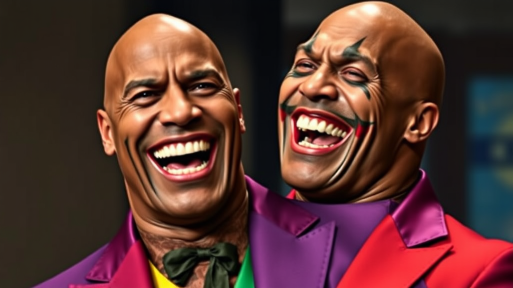 The Rock, donning a vividly colorful Joker costume, bursts into hearty laughter, his grin painted mischievously across his face, embodying a playful and enigmatic charm.