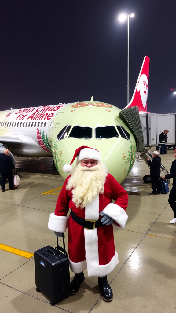 The Santa Claus Airline proudly unveils its festively adorned Airbus A320, sporting vibrant Christmas-themed decorations at the bustling airport, with Santa himself joyfully greeting travelers on the ground.