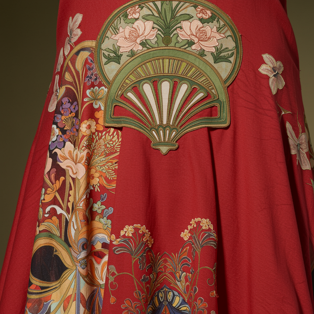 The scarlet gown is adorned with a rich fusion of artistic movements and styles, featuring intricate floral patterns reminiscent of the Art Nouveau period alongside the striking, angular motifs of Art Deco. Each detail is meticulously integrated into the fabric, forming a breathtaking mosaic of hues and textures. The dress embodies an artistic journey, blending history and design into an evocative expression.