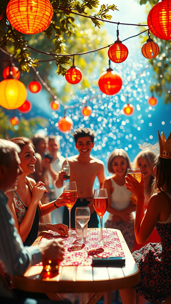 The scene captivates with its mesmerizing allure, drawing the viewer into a vibrant realm of joy and amusement. Every element glistens with unique brilliance, as if infused with laughter and the clink of glasses. The sensation of sunlight's warmth and a gentle breeze invigorates, creating an immersive experience. It is a masterful depiction, destined to uplift and inspire, leaving one in awe of its striking beauty and originality. 3D CGI render, hinting at doll-like features; though slight imperfections such as low resolution and occasional blurring are present, they only add to its quirky charm. Occasional anomalies like duplicated or malformed elements remind of its imaginative nature, embracing the fantastical over the ordinary.