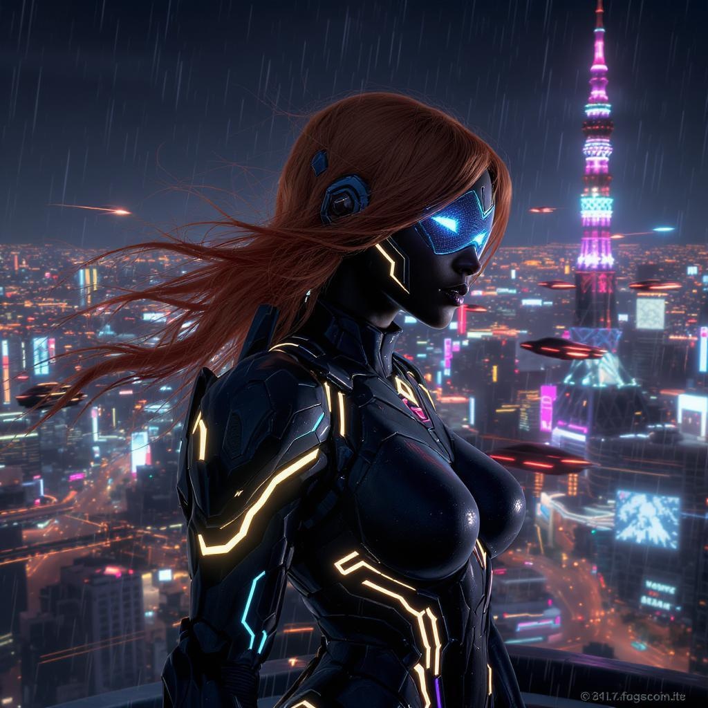 The scene captures a black woman with striking ginger hair in a powerful pose, standing atop a futuristic skyscraper in Neo-Tokyo. Her sleek, angular armor glows with neon accents that pulse rhythmically. The cityscape behind her is a dazzling array of neon-lit skyscrapers, with flying cars zipping by at high speed. As the camera focuses on her, a holographic display from her helmet illuminates her face, showcasing her advanced tech. She scans the metropolis below, vigilant for any signs of danger. This moment blends the gritty cyberpunk vibe of Blade Runner with the high-octane action of Starship Troopers and Dredd, combined with the imaginative storytelling of Pixar and Buzz Lightyear. Directed by Ridley Scott and Ava DuVernay, this film promises an exhilarating visual journey, centered around a strong, empowered black female lead. The scene boasts photorealism, intricate details, and hyperrealistic elements with soft lighting and heavy shadows, crafted to perfection with a cinematic touch that ensures every detail shines. It's an 8k masterpiece that embodies the golden ratio in its composition, offering a high-detail, film photography aesthetic.