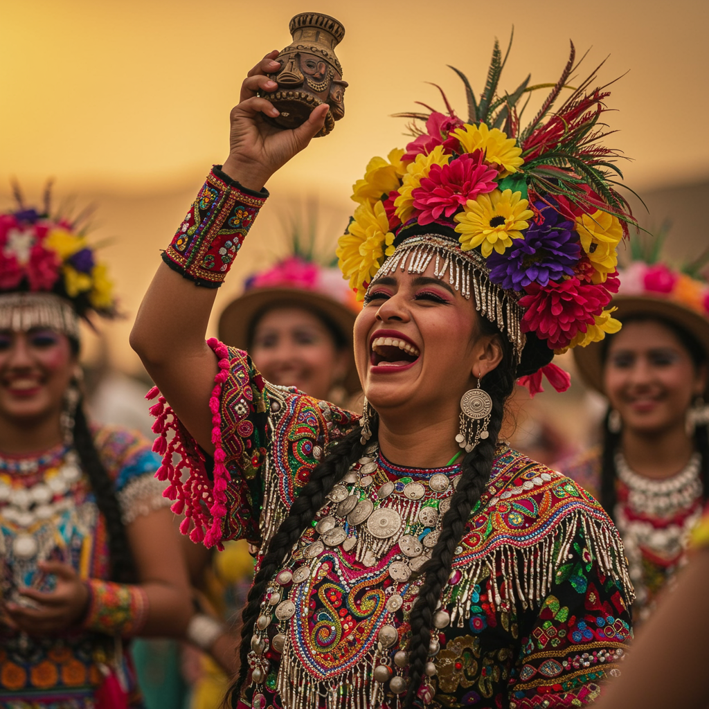 The scene captures a jubilant moment featuring a woman joyfully dressed in traditional attire, known for its celebration of vibrant colors. Her clothing is richly decorated with intricate patterns and shimmering embellishments, and atop her head rests a headdress bursting with brightly colored flowers, offering an eye-catching spectacle. She holds an ornate object aloft, possibly a cultural artifact or festive symbol, toward the sky, her face alight with exuberance and delight. Her eyes are closed in laughter, and her head is thrown back, immersed in the joyous celebration. In the softly blurred background, other individuals dressed in similarly festive, traditional garb share in the merriment, hinting at a lively communal gathering. The warm, golden light enhances the festive atmosphere, imbuing the scene with a sense of vibrant energy and celebration.