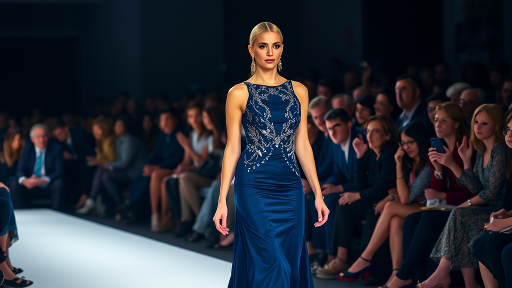 The scene captures a stunning woman in a midnight blue dress adorned with silver details gracefully walking down the runway. She exudes confidence as she commands the spotlight in front of an eager audience. The crowd is a dynamic mix, with some fashion enthusiasts leaning in close to catch every detail, while others watch attentively from the shadows at the back. Her poise and the enthralled audience generate an atmosphere brimming with anticipation and sophistication.