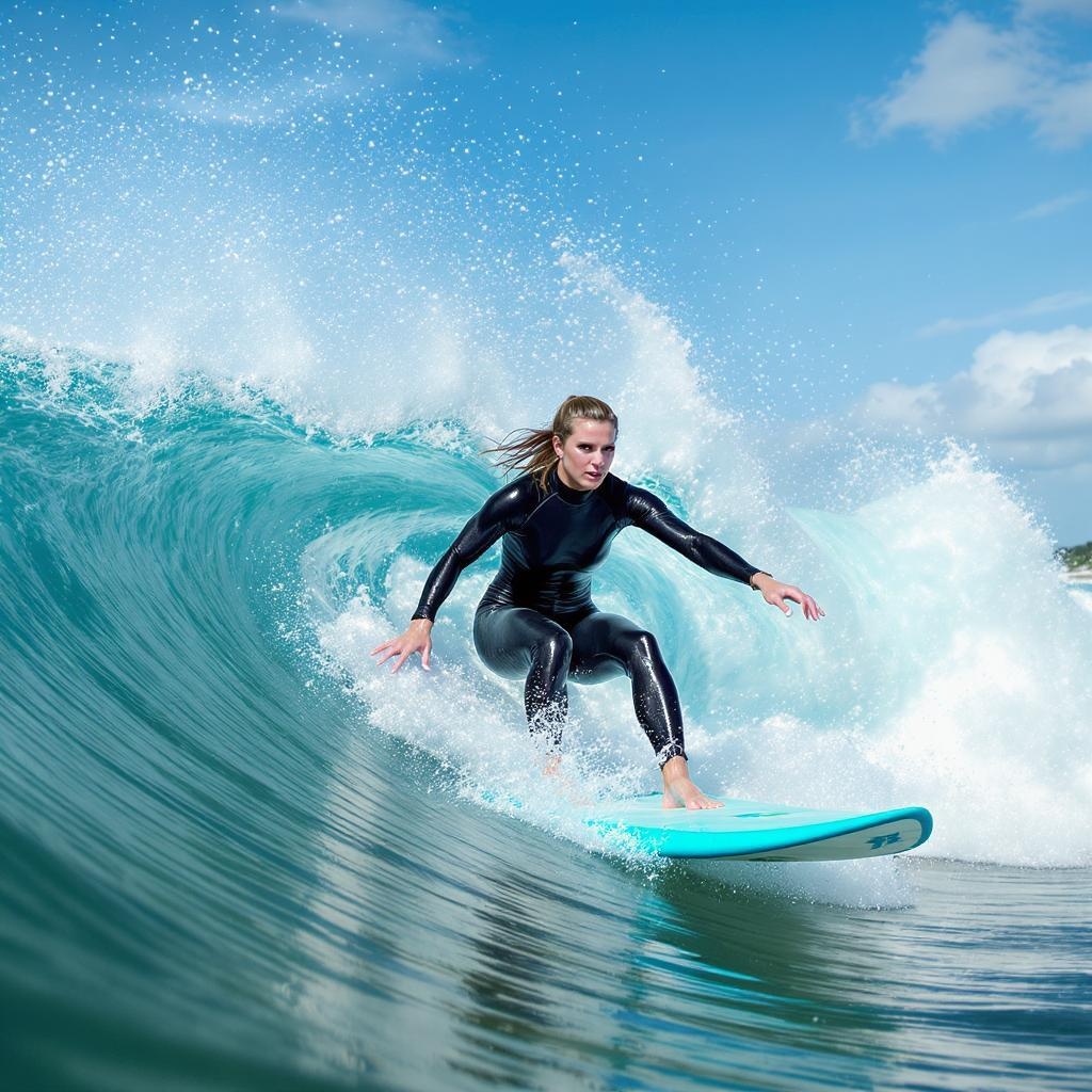 The scene captures a woman gracefully carving through a powerful wave on her surfboard, her poise and expertise evident in every movement. Dressed in a sleek wetsuit designed for optimal protection and agility, she leans into the wave, her body perfectly aligned with the energy of the ocean. The vibrant surfboard cuts through the water, placing her at the heart of the action as she revels in the exhilaration of the ride. The sun glints off the cresting wave, highlighting her focused expression and the dynamic interplay between human and nature.