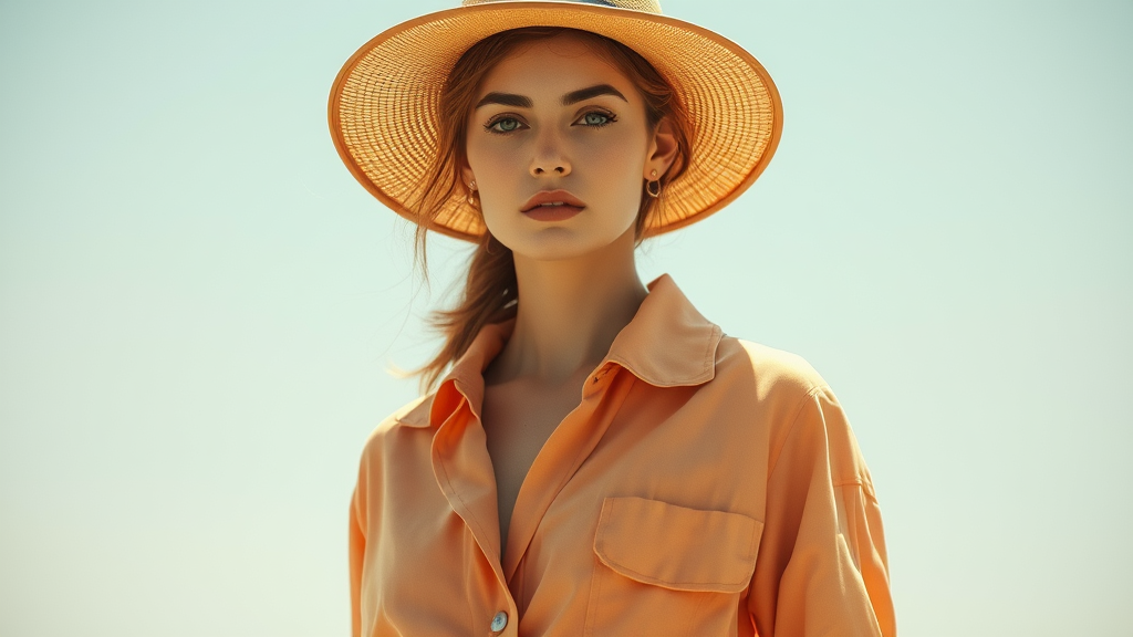 The scene captures a woman with an air of effortless sophistication, her hands casually tucked into the deep pockets of her loose, elegantly draped attire, reminiscent of the abstract, whimsical style of Eugène Brands. The photograph exudes a sun-drenched, retro color palette that harkens back to timeless summer reveries. Her features echo the refined grace of Lance Reddick, with an expressive intensity that draws the viewer in. She dons a wide-brimmed hat, shading her enigmatic expression as if shielding secrets of bygone eras. The ensemble is notably voluminous, harmonizing with the fluid lines and soft focus commonly seen in vintage Hermes advertisements. The overall aesthetic is a nod to the fashion sensibilities of 2020, a bridging of nostalgic silhouettes and modern chic, possibly appearing in an editorial spread or lookbook under the discerning eye of Vogue France. The visual narrative could be titled "Fromme Seele," a soulful exploration of 50s-inspired elegance redefined for the contemporary age.