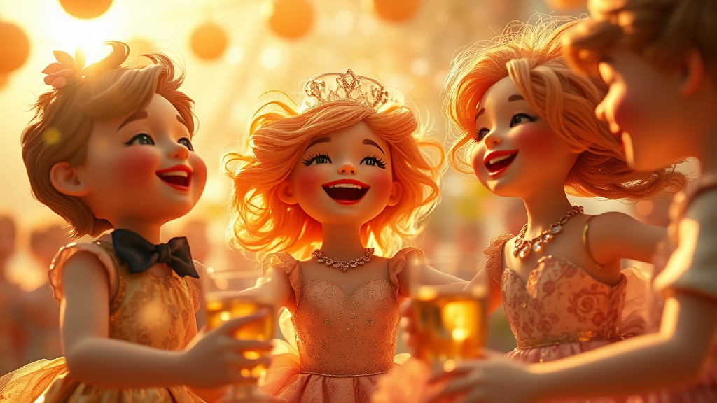 The scene captures an enchanting spectacle of joy, drawing the viewer into a world where laughter and delight reign supreme. Every element glows with a distinct brilliance, inviting the audience to almost hear the laughter and the clinking of celebration. They can nearly feel the sun's warmth and the gentle caress of the breeze. This masterpiece leaves a lasting impression, offering inspiration and awe through its breathtaking beauty and originality. CGI, 3D animation, rendered with Octane, blending the charm of intricately crafted dolls infused with a touch of surreal whimsy. Despite the slightly grainy texture and minor imperfections, such as some haziness and oddity in limb proportions or features, the image persists in conveying a vivid sense of wonder and exuberance.