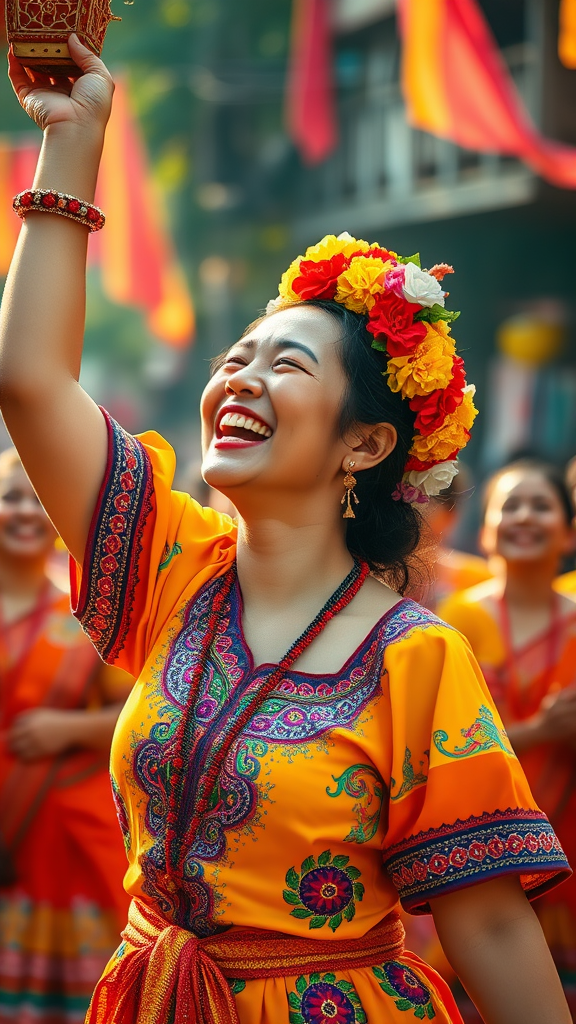The scene captures an exuberant moment, featuring a beaming woman dressed in vibrant traditional attire from a culture renowned for its colorful dress. Her outfit is a stunning display of bright, intricate patterns, embroidery, and shimmering embellishments, and she wears a headdress adorned with an array of flowers, adding a burst of color to her appearance. She is joyfully holding an ornate item skyward, likely a part of the festival or celebration, her expression radiating pure happiness as she laughs with her eyes closed and her head tilted slightly to the side, fully immersed in the joyous festivities. In the background, though slightly blurred, others dressed in similar traditional garb are visible, sharing in the revelry of the cultural gathering. The scene is bathed in warm, golden light, enhancing the vibrant and lively atmosphere of the celebration.