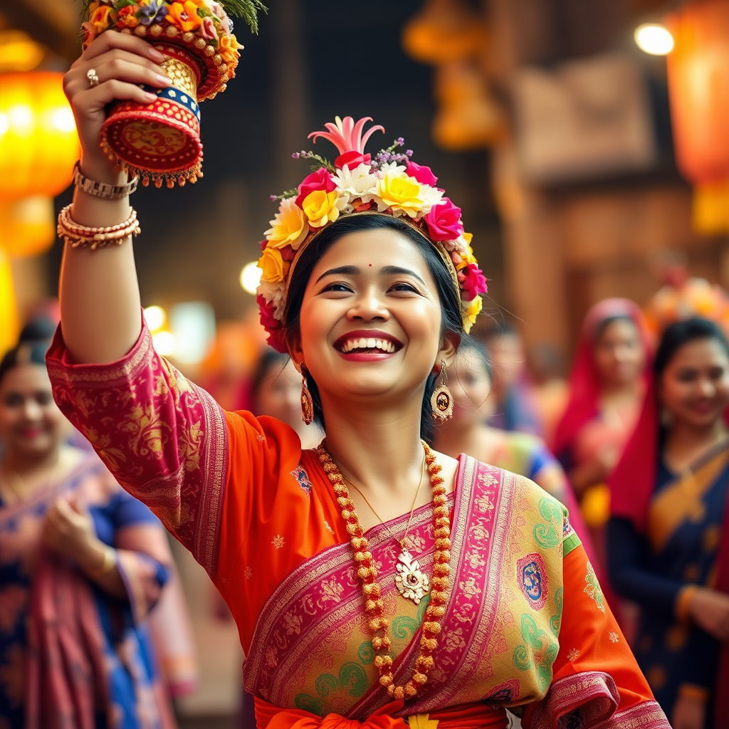 The scene depicts a joyful moment featuring a woman beaming with happiness, dressed in traditional, vibrant clothing characteristic of a culture renowned for its colorful attire. Her outfit is adorned with radiant, intricate patterns and elaborate embellishments, and she wears a headdress adorned with an array of flowers, contributing to her dazzling appearance. In one hand, she holds a beautifully decorated object, possibly linked to a cultural festival or celebration, raising it triumphantly toward the sky. Her face reflects pure joy, with eyes closed and head tilted slightly upwards, fully embracing the festive spirit. In the background, slightly blurred figures in similar traditional attire partake in the merriment, enhancing the sense of a communal cultural gathering. The warm, ambient lighting enriches the scene, heightening the festive and animated atmosphere.