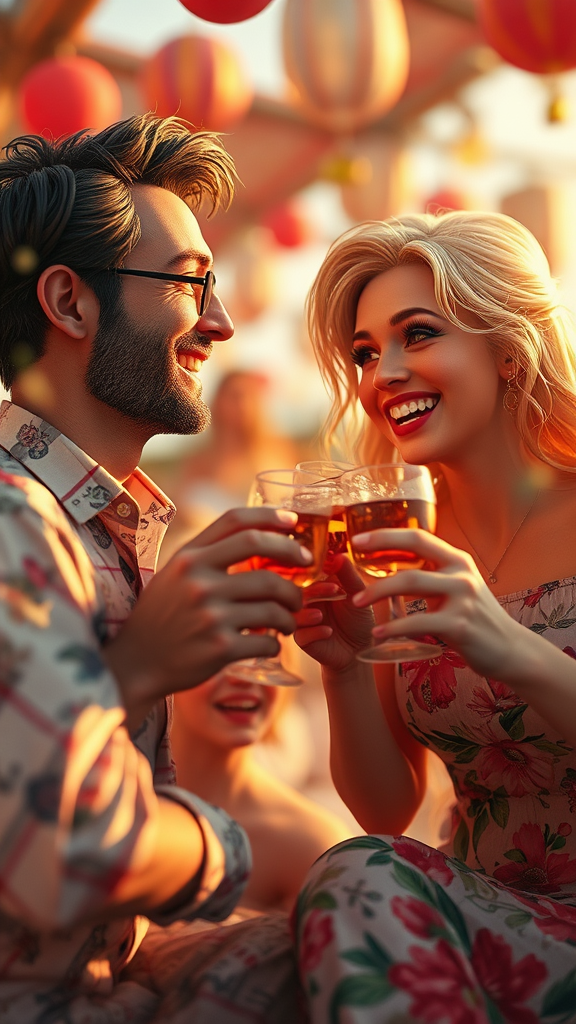 The scene is a mesmerizing spectacle of joy and vitality. As the viewer immerses themselves into the image, they are swept away into a realm overflowing with laughter and delight. Every detail glistens with unparalleled charm, inviting the senses to indulge in a tapestry of vivid experiences. The echo of hearty laughter and the soft melody of clinking glasses seem almost audible; the gentle caress of the sun and the whispering breeze invigorate the spirit. This piece stands as an extraordinary creation, destined to leave its audience feeling buoyant, inspired, and deeply moved by the captivating beauty and originality it embodies. cgi, 3d, doll, octane, render, highly detailed, immersive, high-resolution, captivating, expressive, natural proportions, exquisite anatomy, harmonious composition.