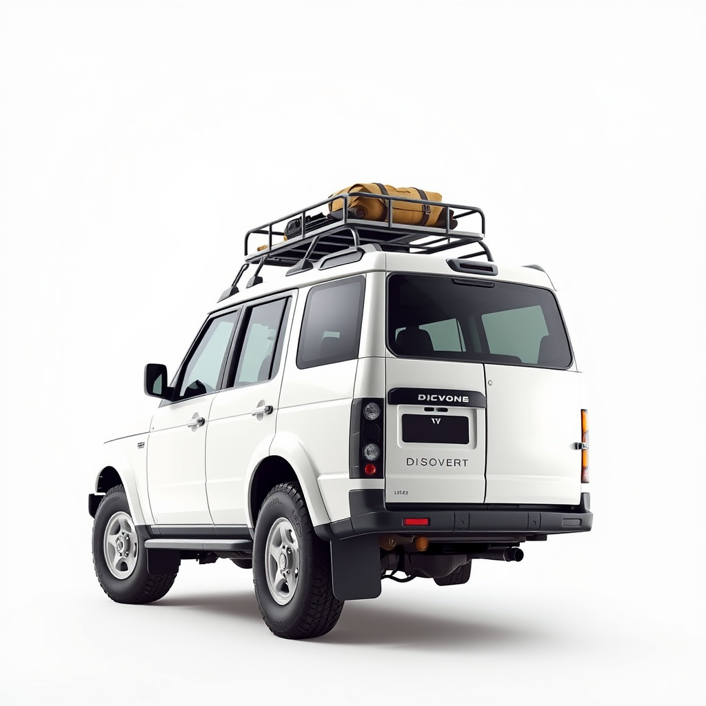 The scene is a striking portrait of a white SUV with a roof rack, reminiscent of a Renaissance masterpiece possibly conjured by Richard Carline. The vehicle is meticulously detailed in a hyper-realistic render as it embarks on a thrilling safari adventure. Set against a pristine white backdrop, the focus is entirely on the SUV, showcasing its adventurous spirit. The design nods to the iconic 90s Discovery One SUV, with the image cleverly captured using a Polaroid octane render. The aspect ratio of 16:9 accentuates the SUV, celebrated as an emblem of exploration and adventure gear. The artwork, potentially created to mark a special milestone or anniversary, features the vehicle in a dynamic half-turn pose, reinforcing its adventurous theme. This portrait, suitable for wall display, embodies a timeless and spirited journey.