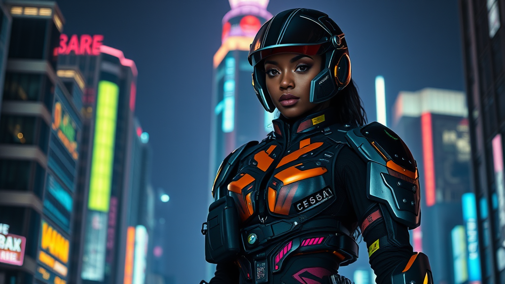 The scene is set in a futuristic Neo-Tokyo cityscape at night, with towering skyscrapers and vibrant neon lights illuminating the metropolis. In the foreground, a striking black woman in her 20s stands tall, clad in a sleek, multicolored cyberpunk afrofuturism armor. The high-tech armor covers her from head to toe, adorned with various gadgets, and it emits a subtle glow that accentuates its detailed design. Her presence exudes confidence and readiness for action. A sophisticated helmet partially conceals her face with a dark visor, but the determination in her expression is unmistakable. The neon cityscape enhances the futuristic atmosphere, creating a visually captivating scene. This moment, directed by Ridley Scott, draws inspiration from the futuristic worlds of Starship Troopers and Dredd, seamlessly blending cyberpunk and afrofuturism aesthetics to craft a unique, visually arresting image.