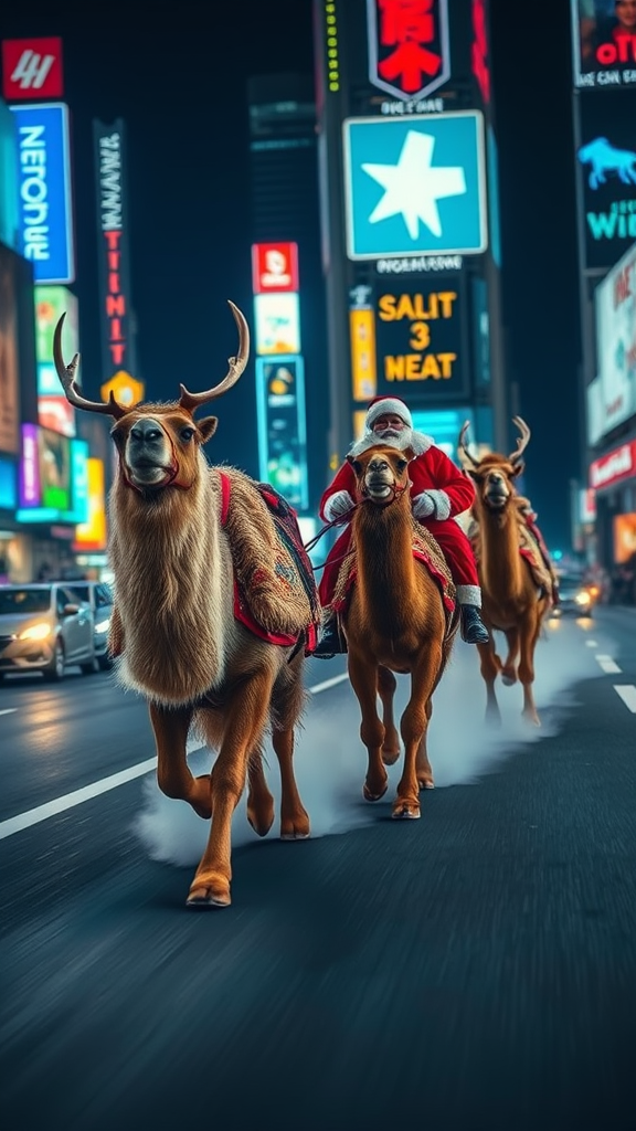 The scene opens with a close-up shot showing the front of Santa's sleigh and the 3 Wise Men's camels, their eyes glinting with excitement under the neon-lit sky. The sound of reindeer neighing mingles with the soft grumbling of the camels, setting the stage for an epic race. As the camera zooms out, we see both teams revving up, Santa in his red suit holding the reins with a gleeful grin, while the Wise Men, adorned in rich, flowing robes, prepare their camels for the challenge. The street is bustling with whizzing cars and glowing billboards, casting vibrant reflections on the polished sleigh and the camels' ornate saddles. Our view shifts to a wide-angle shot capturing the entire ensemble as they take off, accelerating side by side. A trail of smoke and dust swirls behind them, kicked up from the sudden burst of speed. The camera dynamically follows this exciting spectacle, smoothly transitioning from close-ups of Santa’s determined expression to the camels galloping in sync, their hooves rhythmically pounding the ground. As they dash through the urban landscape, the glow of neon lights dances along the sides of the sleigh and camels, adding a magical aura to the race. The cityscape whizzes past in a blur, and we can almost feel the rush of wind, the whole scene exuding an exhilarating sense of speed and festive competition.