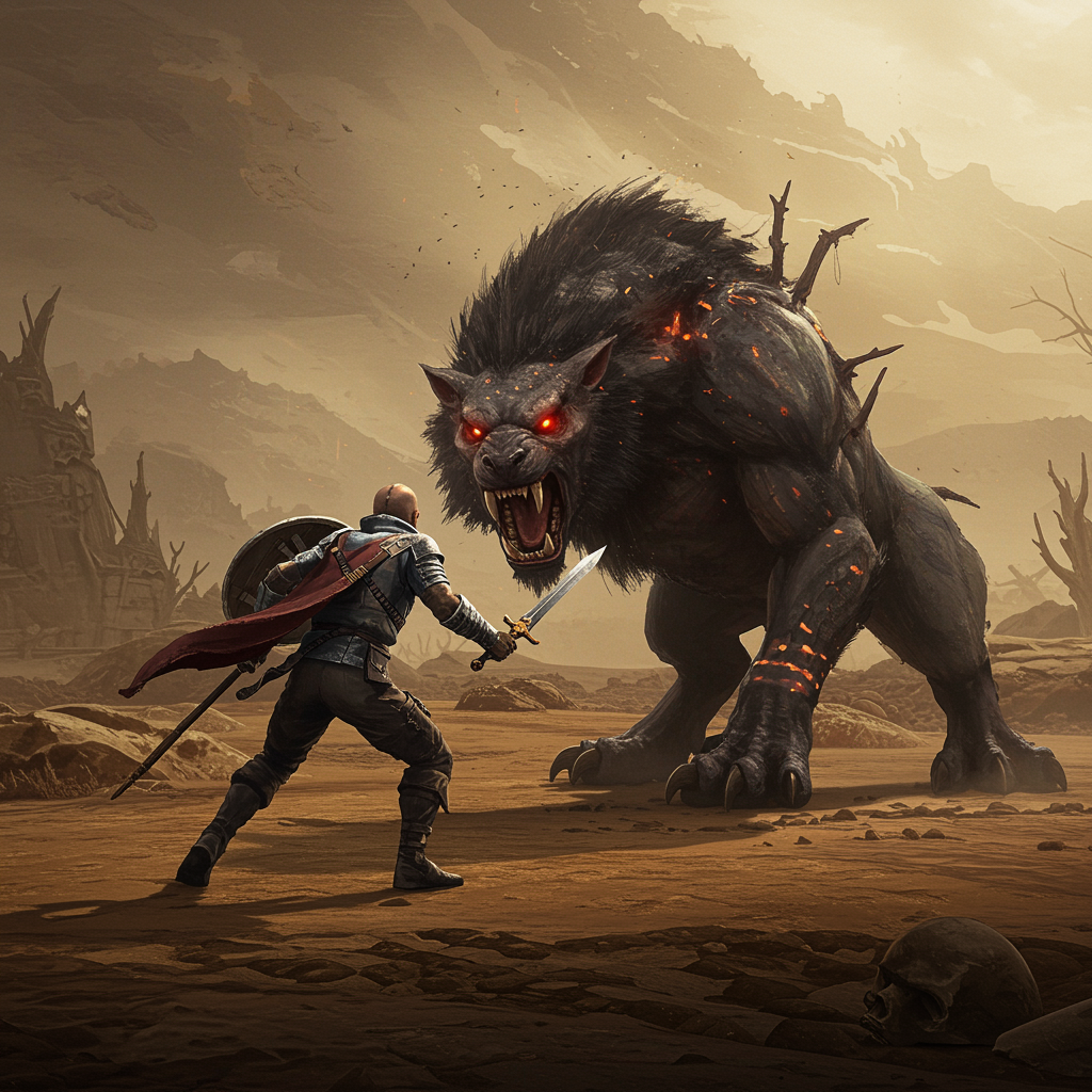 The scene portrays an intense confrontation between a solitary fighter and a formidable beast set against the backdrop of a ruined, barren landscape. The area is lit by striking, contrasting light, highlighting the meticulous intricacies and lively arrangement of the encounter.