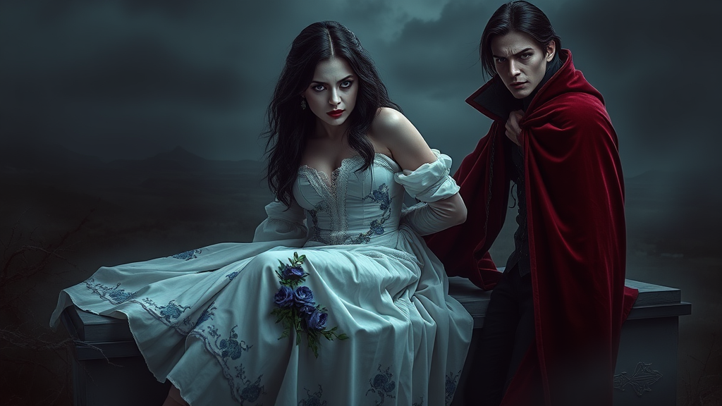 The scene unfolds against a vast, ominous landscape cloaked in shadows. At its heart, a female vampire rises gracefully from her coffin, her eyes shining with a mysterious intensity. Her skin, pale as moonlight, hints at her unearthly origins. Dark hair cascades down her back, shimmering subtly with captured light. A long, flowing white gown envelops her, embroidered with intricate blue floral patterns along the hem and sleeves. The dress bears signs of wear, its fabric delicately tattered, flickering under the light. Her lips, painted a deep, seductive crimson, part slightly to reveal sharp incisors. A faint, crimson glow lingers at the edges of her mouth, and her gaze, fierce and intense, speaks of an insatiable hunger. Beside her, a male vampire stands, his eyes as hauntingly vivid as hers. His skin shares the same ethereal pallor, his dark hair flowing gracefully, catching the light with each subtle movement. He is enveloped in a dark red cloak, richly patterned yet worn, threads glimmering with every shift. His lips, bold and crimson, part to reveal pointed teeth, a subtle glow at each corner, his eyes reflecting a similar ravenous intensity. To the left, twisted trees claw at the turbulent sky, their skeletal branches silhouetted against churning, stormy clouds. On the right, the coffin remains open, its dark interior a mystery. Adorned with intricate carvings, the coffin's silk-lined interior whispers of ancient secrets. The image exudes an atmosphere of chilling suspense, as though the veil between the natural and the supernatural is about to lift.