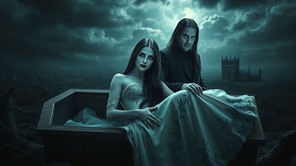 The scene unfolds dramatically against a vast, eerie landscape, where shadows dominate the twisted terrain under a brooding, ominous sky. At the heart of this tableau, a female vampire emerges gracefully from her coffin, her eyes alive with an unearthly brilliance. Her skin, ghostly pale, emanates a subtle glow, betraying her supernatural essence. Dark raven hair spills down her shoulders, catching faint glimmers of moonlight in its glossy strands. She is clad in a flowing, white gown with a delicate blue floral design embroidered along the edges, torn in places, yet sparkling as if woven with threads of light. Her lips, a striking crimson, part to reveal gleaming fangs, while a faint, rosy luminescence at the corners of her mouth hints at recent indulgence. By her side, a male vampire stands, mirroring her intensity with his own radiant gaze. His skin bears the same spectral sheen, and his long, dark hair shimmers with hidden hues. A rich, dark red cloak envelops him, where intricate patterns seem to dance along its worn edges, capturing sporadic glints of light. His parted lips, also a deep red, expose sharp, blood-ready fangs, with an echo of crimson light flickering at the corners. Off to the left, gnarled trees form an intimidating backdrop, their branches clawing towards the rolling, tempestuous clouds above. To the right, the open coffin, luxurious with ornate carvings and lined in soft white silk, beckons with its shadowy recesses. The atmosphere is thick with a sense of impending supernatural events, as if the very air trembles with anticipation of the mystical forces at play.