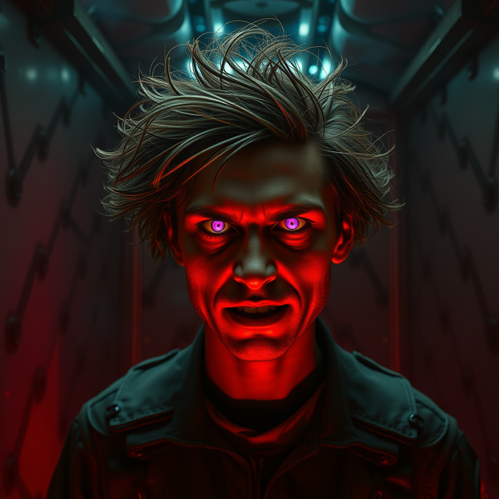 The scene unfolds in a dimly lit chamber pulsating with advanced technology, casting flickering shadows against the walls. Amidst this dark ambiance stands a furious figure with clear, piercing eyes, their hair wildly disheveled and their expression a tapestry of anger and beauty interlaced with a hint of madness. Their eyes, glowing an intense pink, are juxtaposed against a background of swirling rainbow lights, creating an effect both absurd and surreal. Despite the chaos, a small, almost stupid smile plays on their lips as if appreciating the irony of the moment. The person, resembling a soldier, looks both prepared and surprisingly sloppy, caught off guard in this highly detailed hyperrealistic environment. An unexpected storm rages outside, its old paint peeling and cracking under the pressure of the elements, adding to the stunning yet eerie ambiance. The photo is exquisitely captured, with high-focus on intricate details and textures, though some elements remain intentionally out of frame, leaving parts to the imagination. As the scene blurs and shifts in places, there are peculiarities—a subtle glitch revealing extra limbs morphing into grossly proportioned yet strangely fascinating forms. A clichéd beauty marred by cloned features and mutated hands, evoking a sense of the uncanny. Despite these grotesque elements, the overall composition remains remarkably seamless, ultra-realistic, and captivating, challenging the boundaries of perception and reality.
