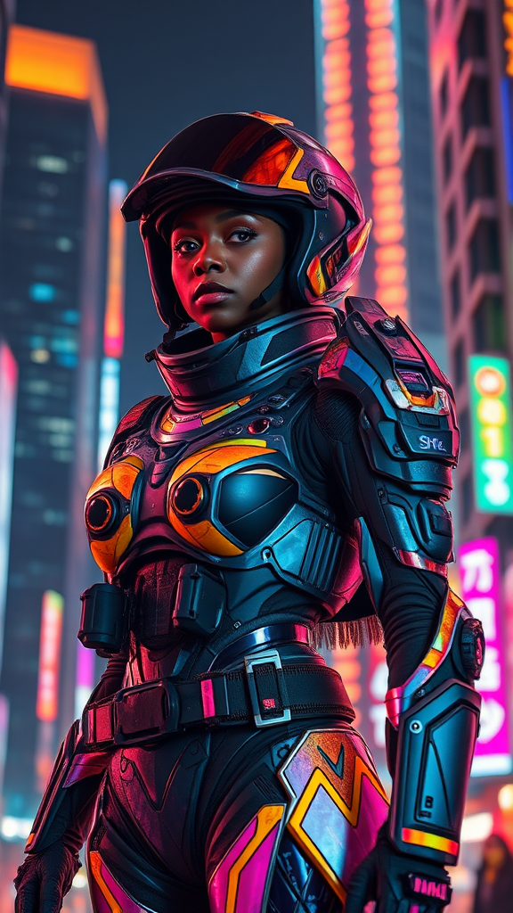 The scene unfolds in a futuristic Neo-Tokyo cityscape at night, where towering skyscrapers and vibrant neon lights cast a colorful glow over the city. In the foreground, a striking black woman in her 20s stands tall and poised. She is donned in an extraordinary multicolored cyberpunk afrofuturism armor that envelops her from head to toe, sleek and sophisticated, with an array of high-tech gadgets seamlessly integrated. Her face is partially concealed by an advanced helmet featuring a tinted visor, only hinting at the fierce determination in her eyes beneath. Her stance exudes confidence and readiness for action, as bright hues subtly illuminate the intricate, mesmerizing patterns of her armor. The neon-lit cityscape enhances the futuristic vibe, painting a visually captivating picture. Directed with vision akin to Ridley Scott, this image draws inspiration from the dynamic worlds of Starship Troopers and Dredd, marrying cyberpunk with afrofuturism to craft a unique and mesmerizing visual narrative.
