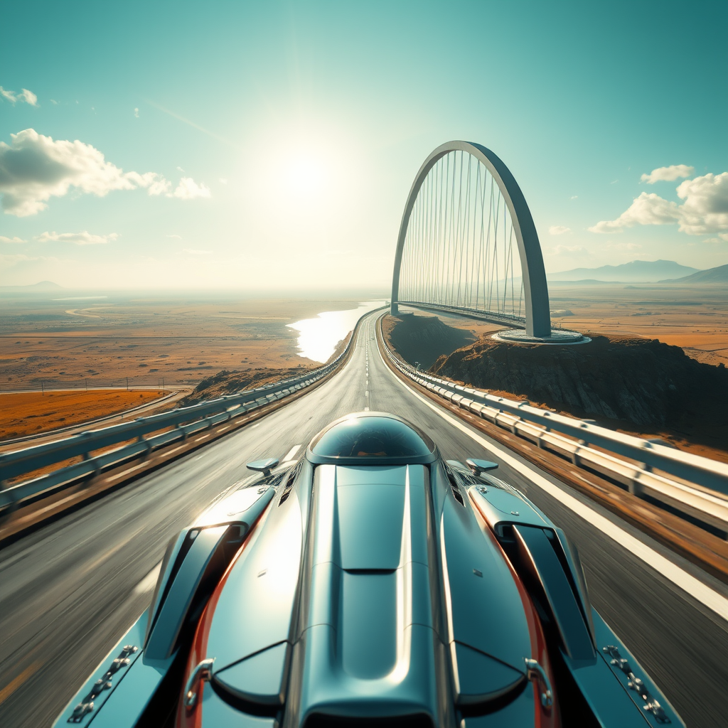 The scene unfolds in a sun-drenched, futuristic landscape where the highway stretches across open fields, ascending gracefully toward a curved bridge that arches over a shimmering river. Leading the charge is a sleek, cyberpunk racing vehicle, its chrome surface reflecting the intense sunlight as it begins its ascent. Suddenly, a gasp-inducing sight unfolds as a massive chasm appears on the track, seemingly swallowing the road ahead, with no alternative bridges in view. The end of the track beyond the bridge remains hidden from sight. The perspective captures the scene from behind and at a slight angle, allowing the viewer to feel the tension as the high-speed machine approaches the daunting void, its path uncertain and fraught with danger.