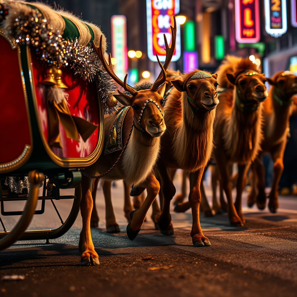 The scene unfolds with a close-up of Santa Claus's sleigh, adorned with shimmering bells and glistening tinsel, and The 3 Wise Men's majestic camels, their bridles sparkling under the glow of the streetlights. The reindeer snort and paw the ground with anticipation, while the camels huff, their breath visible in the chilly night air. Suddenly, the camera zooms out to reveal the bustling urban street, alive with the hum of excitement. Neon lights flicker, casting vibrant hues across the sleigh's polished surface and the camels' adorned harnesses. As the race begins, Santa and The Wise Men lean forward, urging their teams into motion with a spirited shout. In unison, they surge forward; the reindeer leap into a gallop, and the camels bound forward, powerful legs kicking up dust. The camera follows their progress with a smooth glide, capturing the sleek sleigh cutting through the air and the camels' rhythmic strides. As they accelerate, a trail of smoke and sparks dances in their wake, a testament to their speed and determination. The cityscape blurs past, a kaleidoscope of colors reflecting off the racing ensemble, underscoring the thrilling pace and exhilarating energy of the nocturnal competition.
