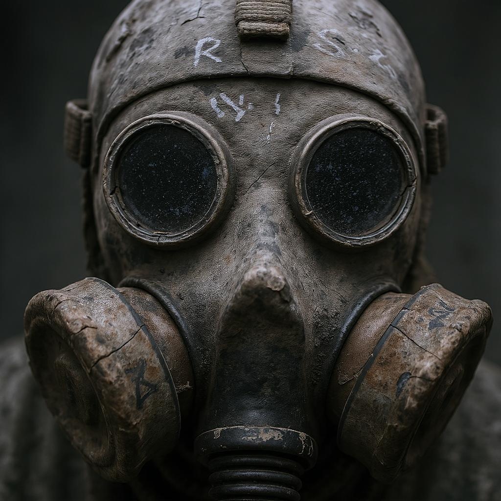 The shot captures the gritty detail of a Chernobyl liquidator's gas mask, focusing on its worn, authentic look reminiscent of Soviet-era designs. The rounded lenses, coated with a thin layer of dust, reveal the heavy burden of the reactor's fallout. Thick rubber seals, cracked and aged, border the lenses, while robust straps, frayed from use, hold the mask firmly in place. The surface is speckled with ash and grime, with faint traces of faded stencil markings adding an air of silent history to the piece. The image evokes a sense of resilience amidst the chaos.