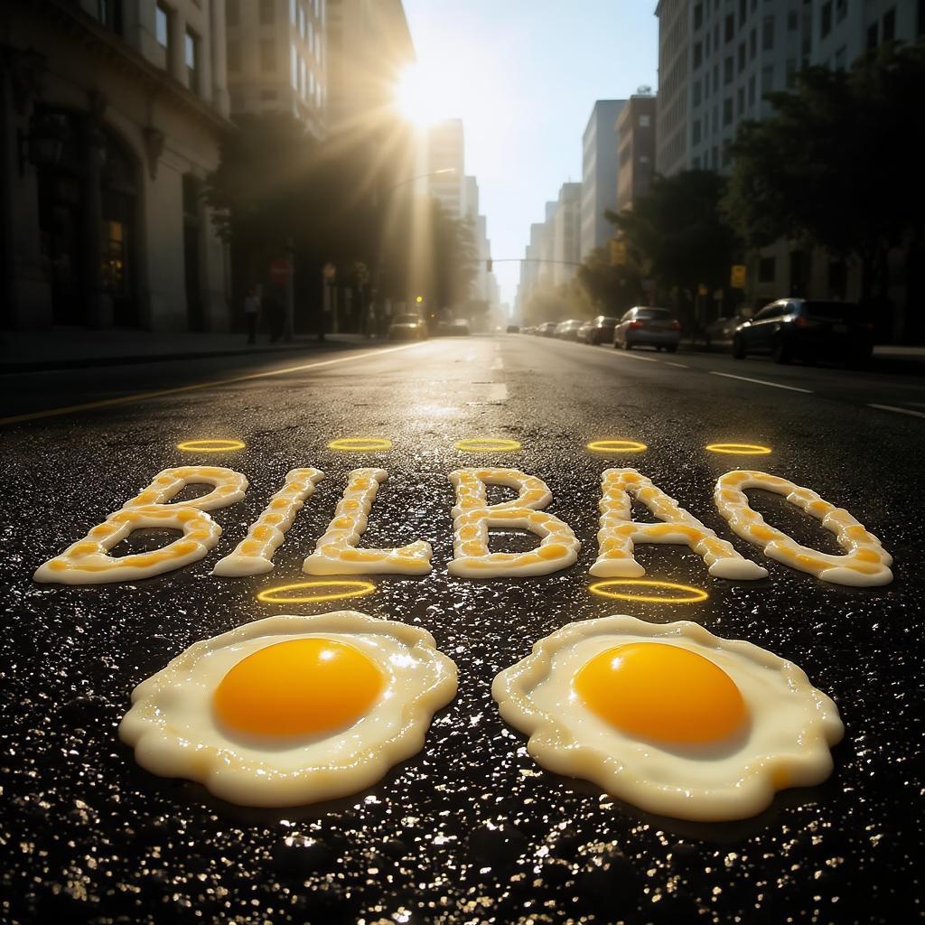 The sizzling midday sun casts its glare on the city street where the word "BILBAO" is cleverly crafted from vibrant, sunny-side-up eggs cooking on the scorching blacktop, their edges curling into delicate golden halos.