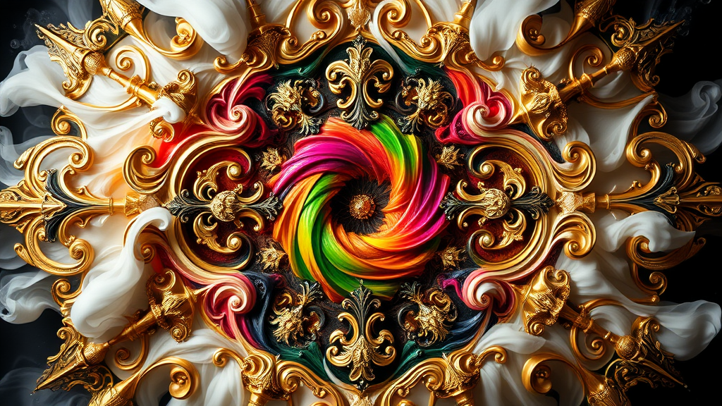 The source of future growth is depicted through a dramatic and elaborate emotive style, drawing inspiration from the Golden Baroque and Rococo aesthetics. This artwork emphasizes beauty as a transcendental experience with seamless patterns, symmetrical compositions, and large, intricate motifs reminiscent of the Sistine Chapel ceiling. In 8K resolution, the image is supersharp, showcasing spirals and swirls characteristic of the Rococo style, adorned with ornate cartouches. White smoke blends with rainbow ink, swirling elegantly in water, accentuating gold, black, and vibrant rainbow hues. The composition achieves perfect symmetry, with a 3D appearance and no blur, capturing a photorealistic quality with insanely detailed intricacy. Cinematic lighting enhances the scene, rendered with Octane for an epic and immersive visual experience.