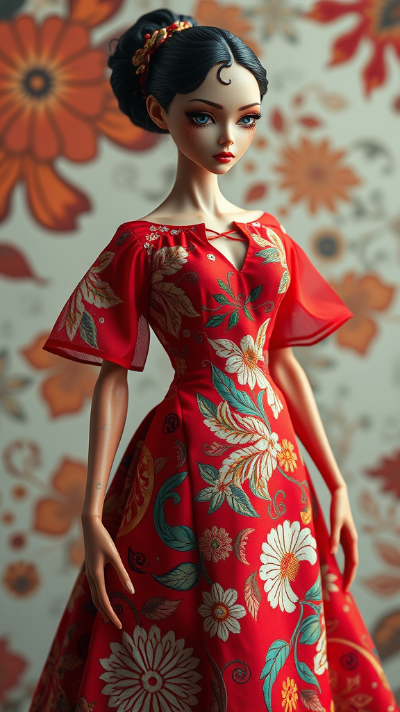 The striking red dress is adorned with an eclectic mix of art movements, from the intricate floral motifs of the Art Nouveau era to the striking geometric designs of Art Deco. Each detail is intricately woven into the fabric, forming a captivating tapestry of vibrant color and rich texture. Rendered in CGI with 3D detailing, the doll-like figure showcases the dress in an Octane render. Despite the low-resolution quality, the imperfections such as text errors, cropped and duplicated elements, and jpeg artifacts create a surreal distortion. The blurred and mutated features, like elongated necks and malformed limbs, add an unusual charm, blending artful elegance with an otherworldly appearance. Though the anatomy and proportions are bizarre, with extra fingers and limbs, the overall effect is an abstract masterpiece, evoking both intrigue and unease.