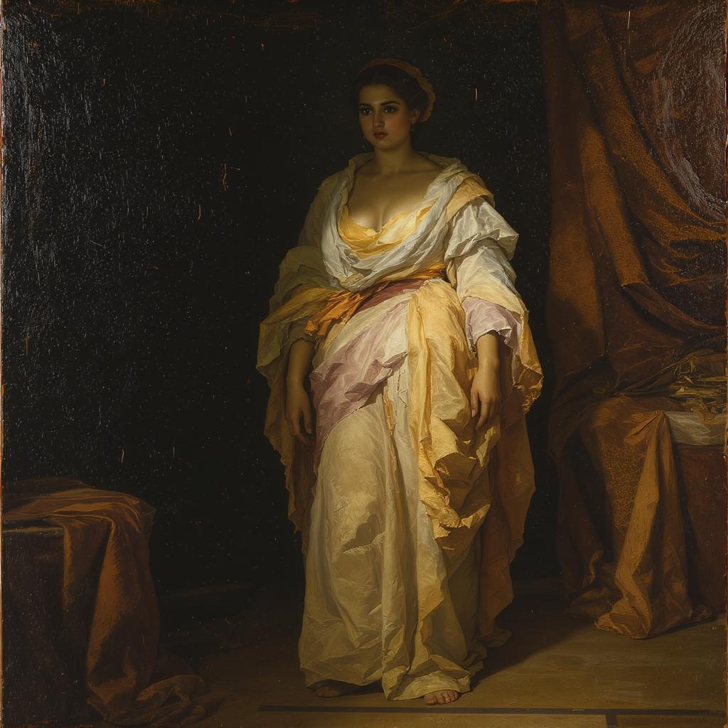 The textures are lush and diverse, with the brushwork imparting a sense of depth and dimension that invites you to explore the painting further. The folds of the individual's garment are meticulously detailed, with each stitch and seam exquisitely depicted.