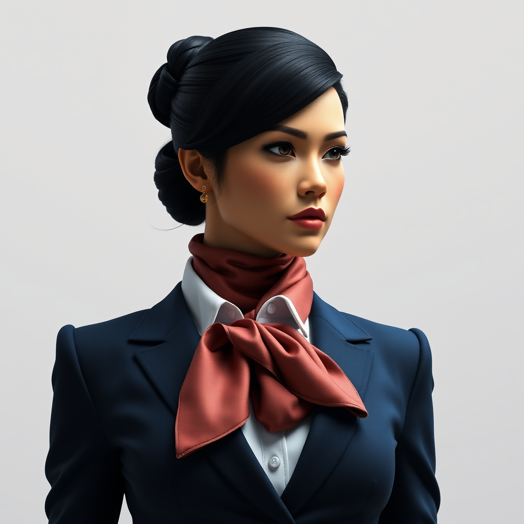 The ultimate embodiment of female authority and elegance stands as a beacon of power. Clad in a flawlessly tailored navy blue pantsuit paired with a pristine white button-up shirt, her ensemble is completed by a rich silk scarf elegantly encircling her neck. Her jet-black hair is slicked back into a polished bun, accentuating her distinguished features and intense gaze. The art beautifully captures her expression, conveying a profound sense of resolve and intellect. This high-resolution masterpiece presents the meticulous stitching of her suit, the plush texture of the scarf, and the subtle gleam of her patent leather heels. The style merges hyper-maximalist elements of Art Deco and Art Nouveau with a modern essence. Gold leaf and metallic touches enhance the piece, demonstrating an exceptional attention to detail. This pioneering artwork inspires awe, with its unique representation of a formidable female icon. A breathtaking, monumental creation, it encapsulates the spirit of contemporary femininity and power, rendered with cgi and 3d techniques for a striking, immersive effect.