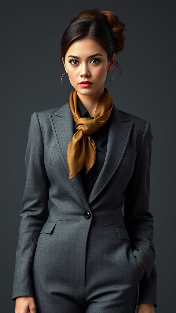The ultimate female businesswoman is a vision of power and sophistication. She stands tall, exuding confidence in her impeccably tailored charcoal gray pantsuit, paired with a sleek black button-up shirt and a chic silk scarf elegantly tied around her neck. Her chestnut hair is styled in an elegant chignon, accentuating her striking features and intense gaze. The artwork's detailed realism captures the subtle nuances of her expression, conveying determination and intellect. The high-resolution image showcases the intricate stitching of her suit, the richness of the silk scarf, and the subtle sheen of her polished leather pumps. The art style is hyper-maximalist, combining Art Deco and Art Nouveau elements with a modern twist. Gold leaf and metallic accents add depth and dimension, highlighting the exquisite attention to detail. This artwork evokes awe with its unique depiction of a powerful female figure, a stunning masterpiece that embodies modern femininity and strength.