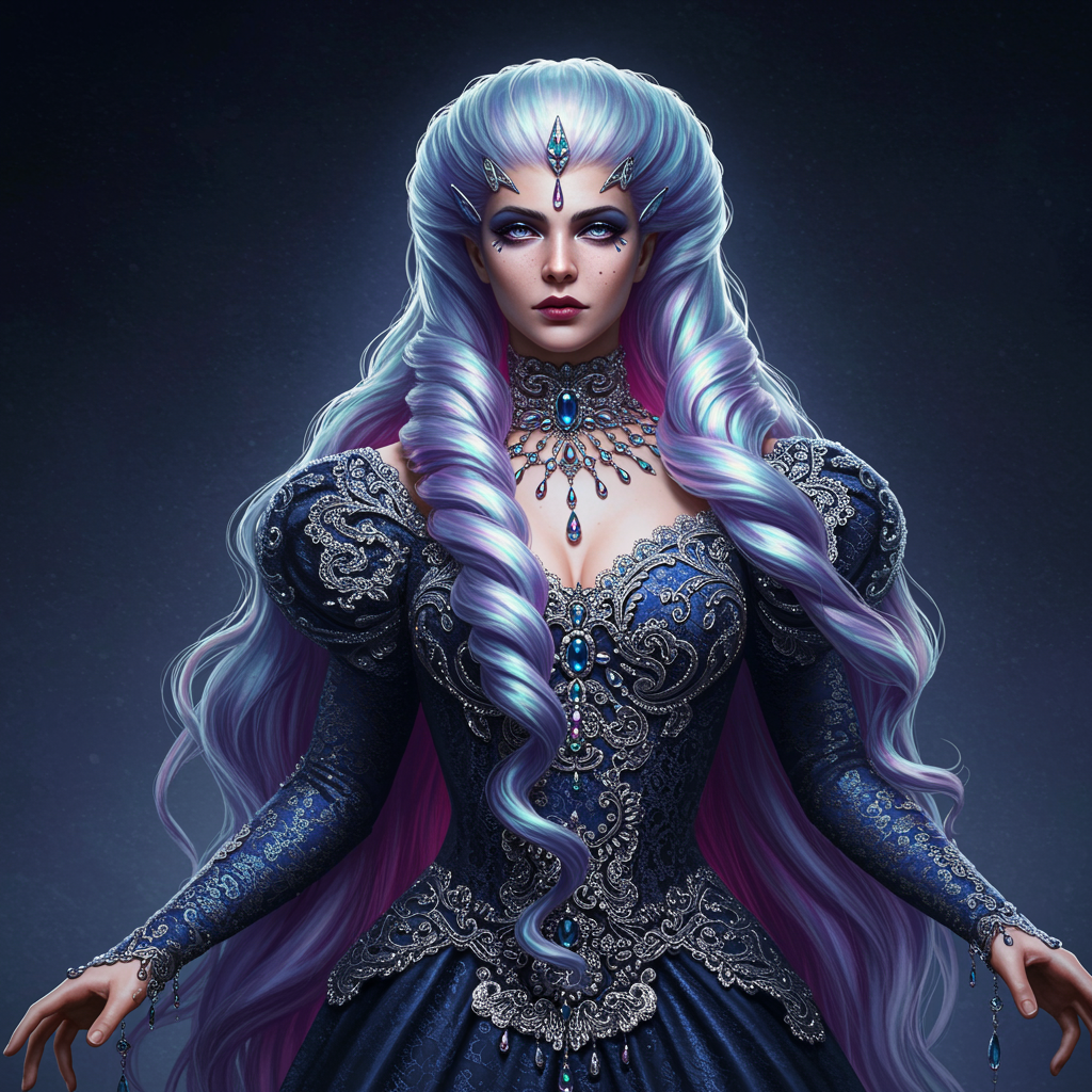 The ultimate space princess captivates with her resplendent presence; her gown shimmers in ethereal shades of deep indigo and silver, adorned with intricate lace patterns and encrusted with shimmering gemstones. Her cascading hair flows down her back in iridescent waves, perfectly framing a face that embodies pure beauty and grace. Crafted by the hyper-realistic artist Kazuhiro Tsuji, this masterpiece seamlessly blends Baroque and Art Nouveau styles, showcasing meticulous attention to detail that leaves viewers mesmerized.