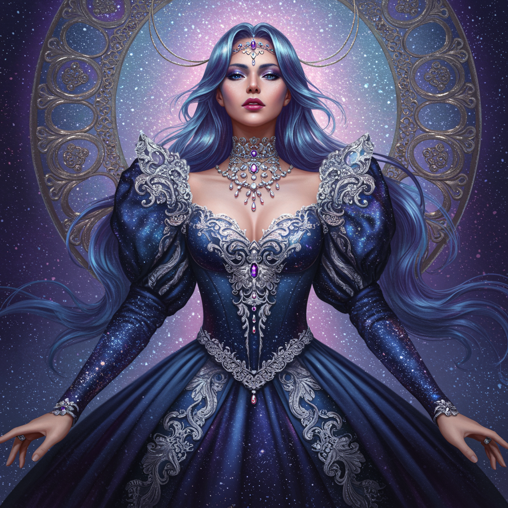 The ultimate space princess is an extraordinary vision, her elegant gown shimmering with celestial hues of deep indigo and silver, adorned with intricate lacework and studded with twinkling gemstones. Her long hair flows like a cascade of iridescent waves, framing a face that exudes sublime beauty and elegance. Crafted by the hyper-realistic artist, Kazuhiro Tsuji, this artwork merges Baroque and Art Nouveau styles with exquisite attention to detail, creating a stunning masterpiece that captivates viewers.