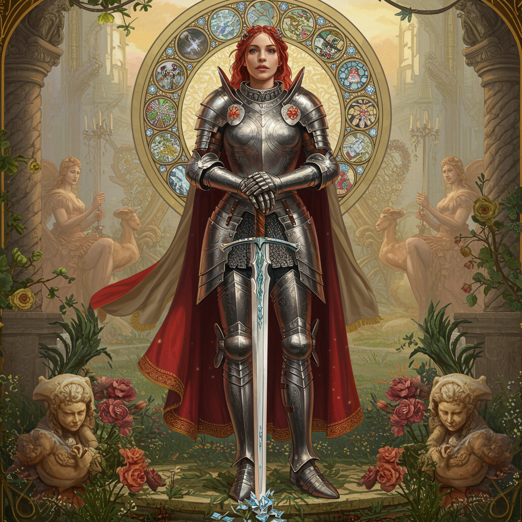 The Ultimate Warrior Princess stands confidently at the heart of the image, embodying both strength and elegance. She is adorned in exquisite armor and holds a sword embedded with shimmering diamonds. Enveloped by a fantastical landscape, the scene is depicted in hypermaximalist detail, seamlessly blending elements of Art Nouveau, Baroque, and Rococo. The masterpiece invokes awe and wonder, presenting a groundbreaking visual that captivates the imagination.