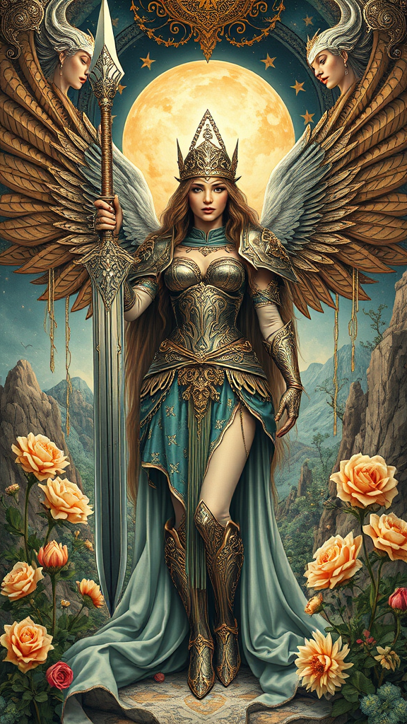 The Ultimate Warrior Princess stands proudly at the heart of the scene, embodying both strength and elegance. She dons intricately designed armor and brandishes a sword adorned with sparkling diamonds. She is encircled by a fantastical landscape depicted with hypermaximalist intricacy. The artwork is a stunning fusion of styles, combining the flowing forms of Art Nouveau, the grandeur of Baroque, and the decorative intricacies of Rococo. This masterpiece evokes a profound sense of awe and wonder, capturing the imagination with its striking composition and vibrant details.