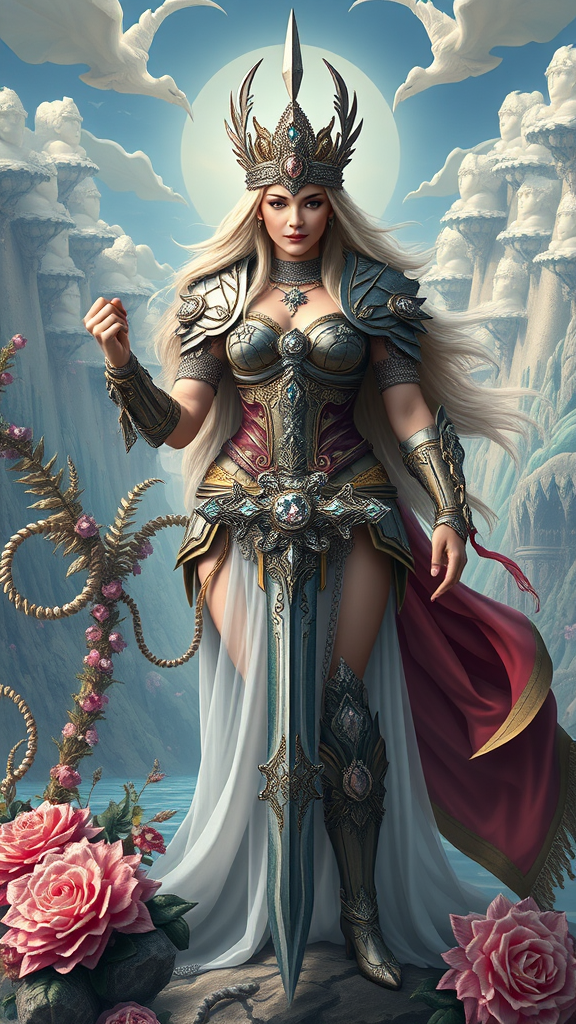 The Ultimate Warrior Princess stands proudly in the heart of the image, embodying both power and elegance. She is adorned in intricate armor and wields a sword embellished with diamonds, set against a backdrop of fantastical scenery crafted with hypermaximalist precision. This artwork seamlessly blends the styles of Art Nouveau, Baroque, and Rococo, creating a revolutionary and stunning masterpiece that evokes feelings of marvel and enchantment.