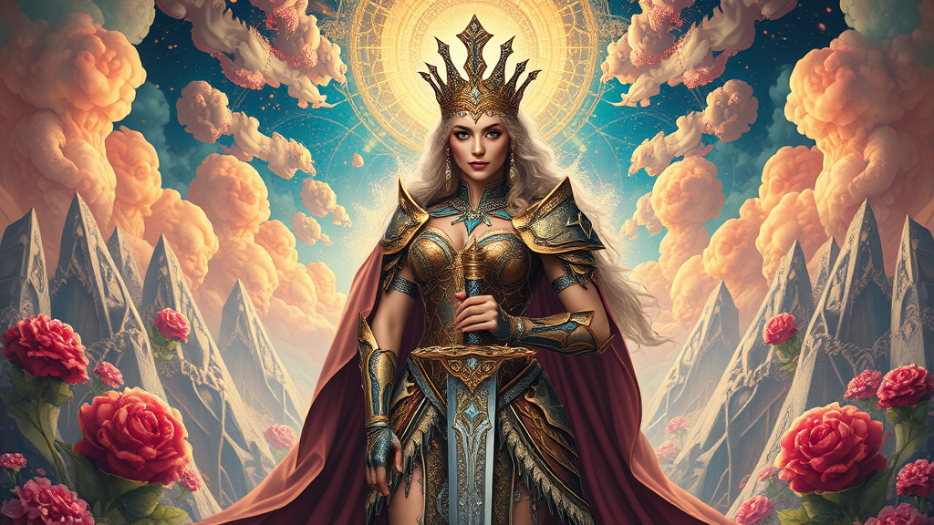 The Ultimate Warrior Princess stands regally at the heart of the image, radiating power and elegance. She wears intricate armor and holds a sword encrusted with shimmering diamonds, surrounded by a fantastical landscape crafted in stunning hypermaximalist detail. The artwork masterfully blends elements of Art Nouveau, Baroque, and Rococo, creating an extraordinary masterpiece that evokes awe and wonder.