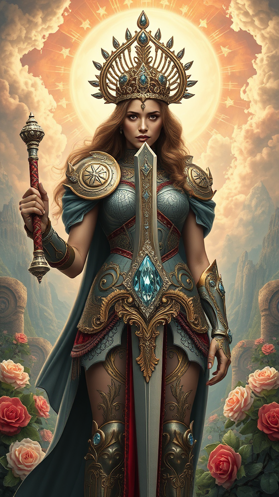 The Ultimate Warrior Princess stands regally in the heart of the image, radiating both power and elegance. Adorned in intricately crafted armor and brandishing a sword encrusted with shimmering diamonds, she is enveloped by a fantastical landscape depicted in exquisite hypermaximalist detail. The artwork skillfully blends elements of Art Nouveau, Baroque, and Rococo, culminating in a groundbreaking masterpiece that evokes awe and wonder.