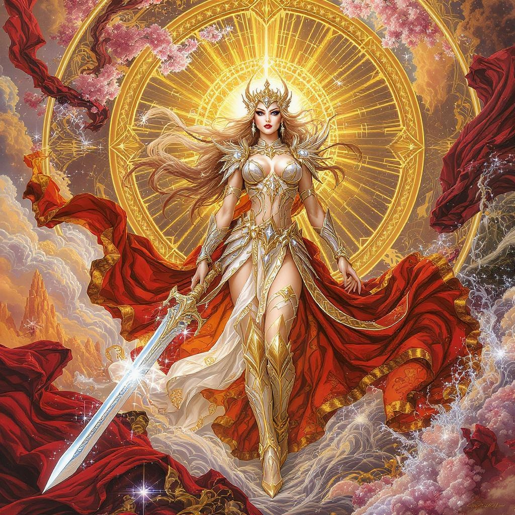 The Ultimate Warrior Princess stands tall at the center of the image, embodying both strength and elegance. She is adorned in intricate armor and holds a sword embedded with shimmering diamonds. Surrounding her is a fantastical landscape, depicted with richly detailed hypermaximalist flair. The artwork masterfully blends influences from Art Nouveau, Baroque, and Rococo styles, creating a spectacular masterpiece that evokes awe and wonder.