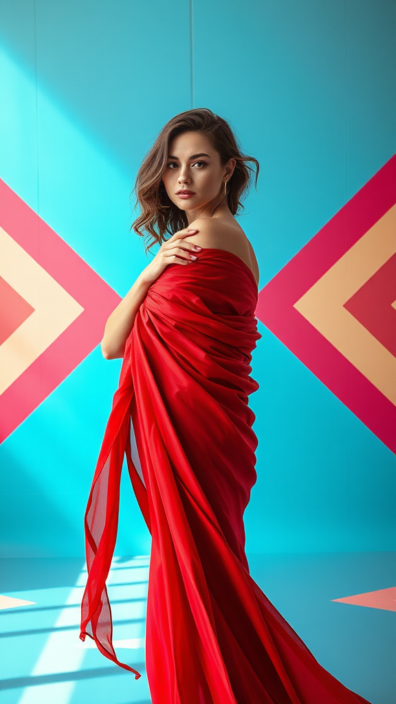 The vibrant photograph features a stunning Instagram fashion model wrapped in a flowing red garment, striking a pose amidst a backdrop inspired by colorful geometric patterns. The image draws from the artistic influences of Guy Aroch and Helene Knoop, brought to life using cutting-edge Unreal Engine 5 technology. The scene is awash with glowing pastels and bold, striking lines, in an explosion of bright and sun-soaked colors. Captured with the precision of a Fujifilm X-T4 and the clarity of a Sony FE 85mm lens, the portrait exudes an air of sophisticated raw style, providing a visual feast of color and form.