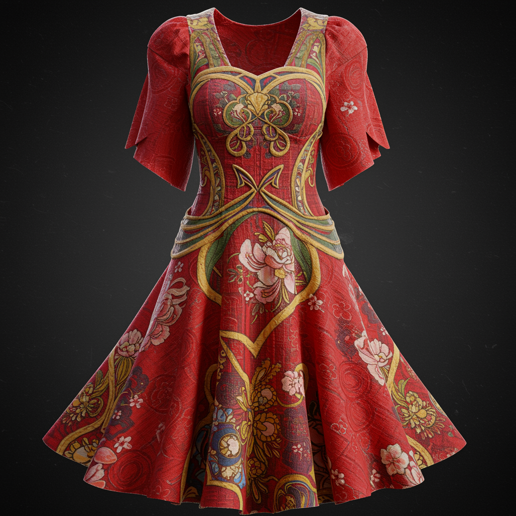 The vibrant red dress showcases a fusion of artistic styles, weaving together intricate floral motifs reminiscent of Art Nouveau with striking geometric designs of the Art Deco period. The harmonious blend of colors and textures forms an exquisite tapestry, revealing a masterful craftsmanship. Rendered as a digital 3D model, the dress emanates a mesmerizing beauty, though subtly obscured by jpeg artifacts and a low-resolution finish. The overall appearance is slightly marred by visual imperfections such as distorted anatomy and flawed proportions, with occasional cloned or fused elements. Despite these artistic challenges, the piece remains a captivating exploration of artistic expression.