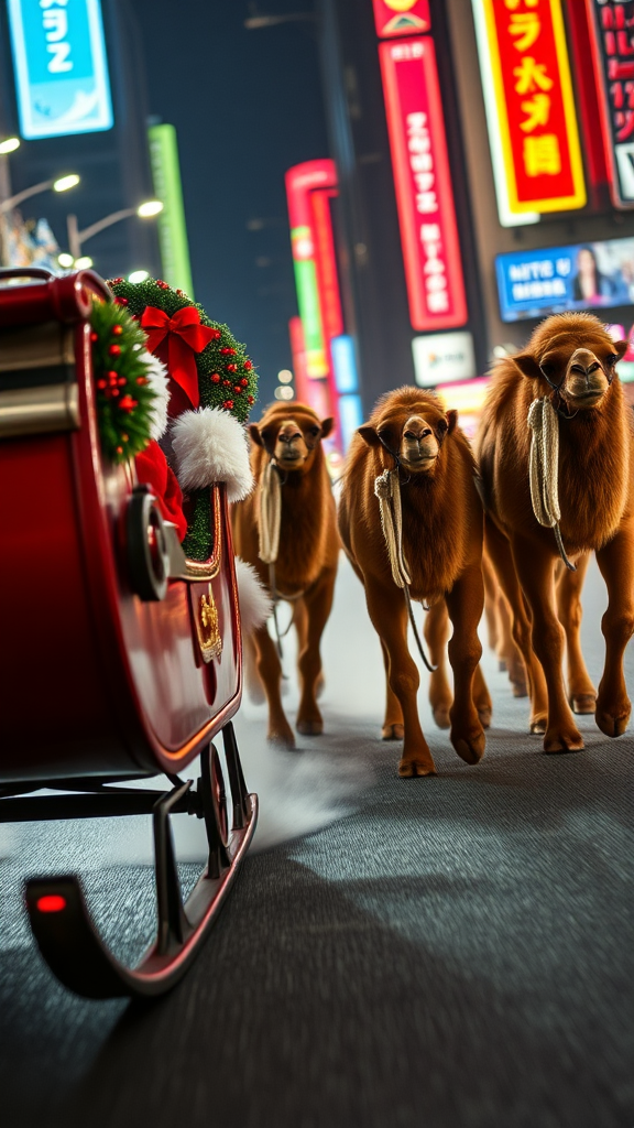 The video sequence opens with a tight close-up of Santa Claus's shiny sleigh, its front adorned with festive decorations and gleaming in the streetlights. Alongside, the three majestic camels of the Wise Men stand proudly, their eyes full of competitive spirit. You can hear the excited neighing from Santa's reindeer and the camels, building anticipation. Abruptly, the scene shifts to a wide shot, capturing the sleek profile of Santa's sleigh and the regal camels, poised for a grand race down a bustling urban street. With a sudden burst of energy, both teams accelerate, their movements synchronized, leaving behind a dramatic trail of smoke. The camera glides smoothly alongside them, showcasing the vibrant cityscape with neon lights reflecting vividly off the sleek surface of the sleigh and the golden hues of the camels. As they speed through the night, the pace quickens, immersing the viewer in the electrifying race. Seamless transitions guide the eye from the intricate details of the contenders to the grand scale of the city, merging close-ups and expansive shots into an exhilarating experience.